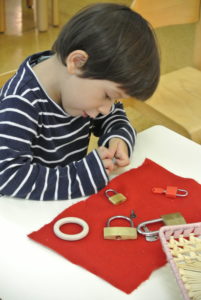 Entre 3 et 6 ans, l’enfant travaille souvent seul, car il n’a pas encore intégré l’autre comme un partenaire de travail. Il travaille majoritairement avec un matériel sensoriel et autocorrectif afin d’acquérir la maîtrise de son corps, le raffinement de ses sens, la mise en commun de ses sens qui donnent naissance au langage, à la lecture, aux mathématiques. Le retour d’information, à cet âge-là, est essentiellement contenu dans le matériel, et l’adulte reste silencieux, pour que l’enfant gagne un maximum de ces informations physiques. En comparaison à des pairs de même âge et de même niveau socio-économique, nous constatons de grands avantages en faveur des élèves Montessori en lecture (pas seulement pour déchiffrer des mots, mais avec une réelle compréhension de leur sens), en mathématiques (comme résoudre de petits problèmes : « Jean a 8 cerises, il en mange 3, combien lui en reste-t-il ? »), en bien-être à l’école et dans leur pensée créative.
